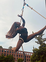 Julia Baccellieri was born and raised in the Chicago performing arts community and began dancing at age 5. When they were 10, Julia started their circus journey and has not stopped since! Julia’s work is grounded in storytelling with a blend of musicality, unique movement, and a dynamic technique. Julia specializes in dance, trapeze, Chinese pool, hula hoops, and acrobatic dance. They also teach workshops and classes striving to lay a strong foundation for future aerialists and people of color who strive to make a living in circus.