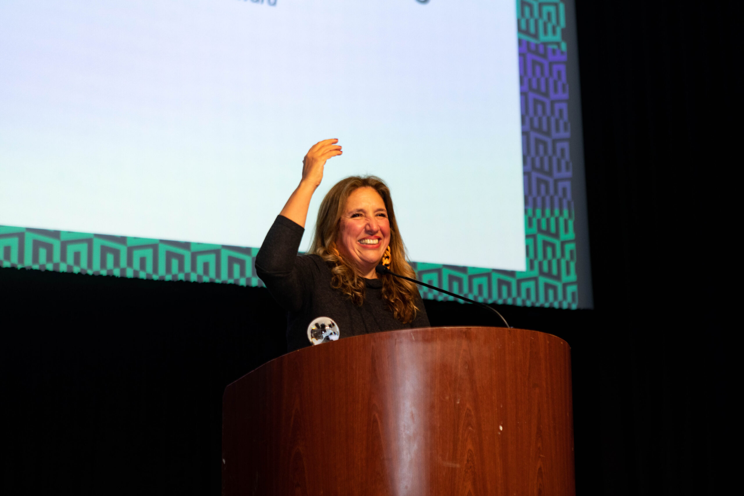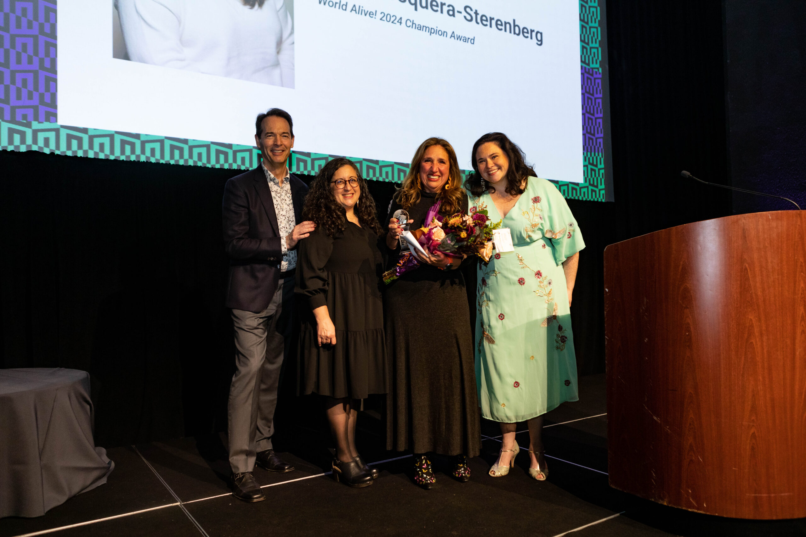 - Jon Andersen-Miller, Zeida Garcia Casillas, World Alive! 2024 Champion Award Honoree Elsa Mosquera-Sterenberg, and ArtsEmerson Director of Artistic Programming, Ronee Penoi